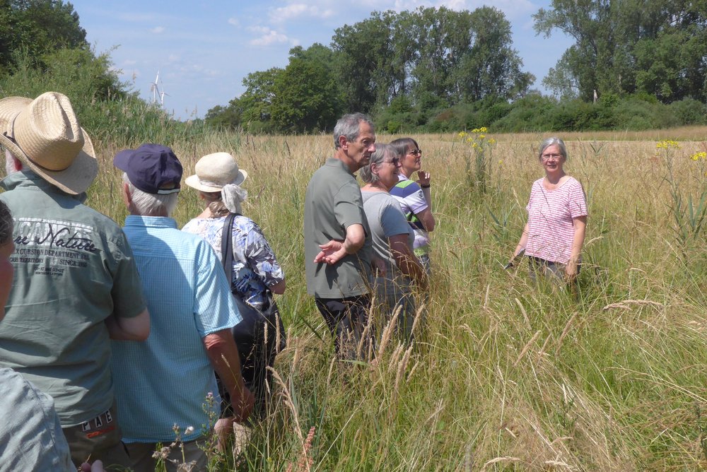 Unter fachkundiger Führung von Dipl.-Biologin Petra Jörns erfuhren die Teilnehmer*innen, deren Zahl aufgrund des sensiblen Naturraums begrenzt war, bei einem Rundgang durch das Naturschutzgebiet an der südlichen Dannstadter Gemarkungsgrenze nicht nur Interessantes über Flora und Fauna, sondern auch einiges über die Historie und Maßnahmen zum Erhalt des kleinsten und zugleich ältesten Naturschutzgebiets im Rhein-Pfalz-Kreis. Bei der rund zweistündigen Exkursion wurden die Besonderheiten dieser Fläche mit ihren Steppenrasen und Stromtalwiesenelementen, den Hügelgräbern, Eichen- und Weidengehölzen und den hier befndlichen tierischen Bewohnern Dunkler Wiesenknopf-Ameisenbläuling und Haarstrangwurzeleule exemplarisch vorgestellt.